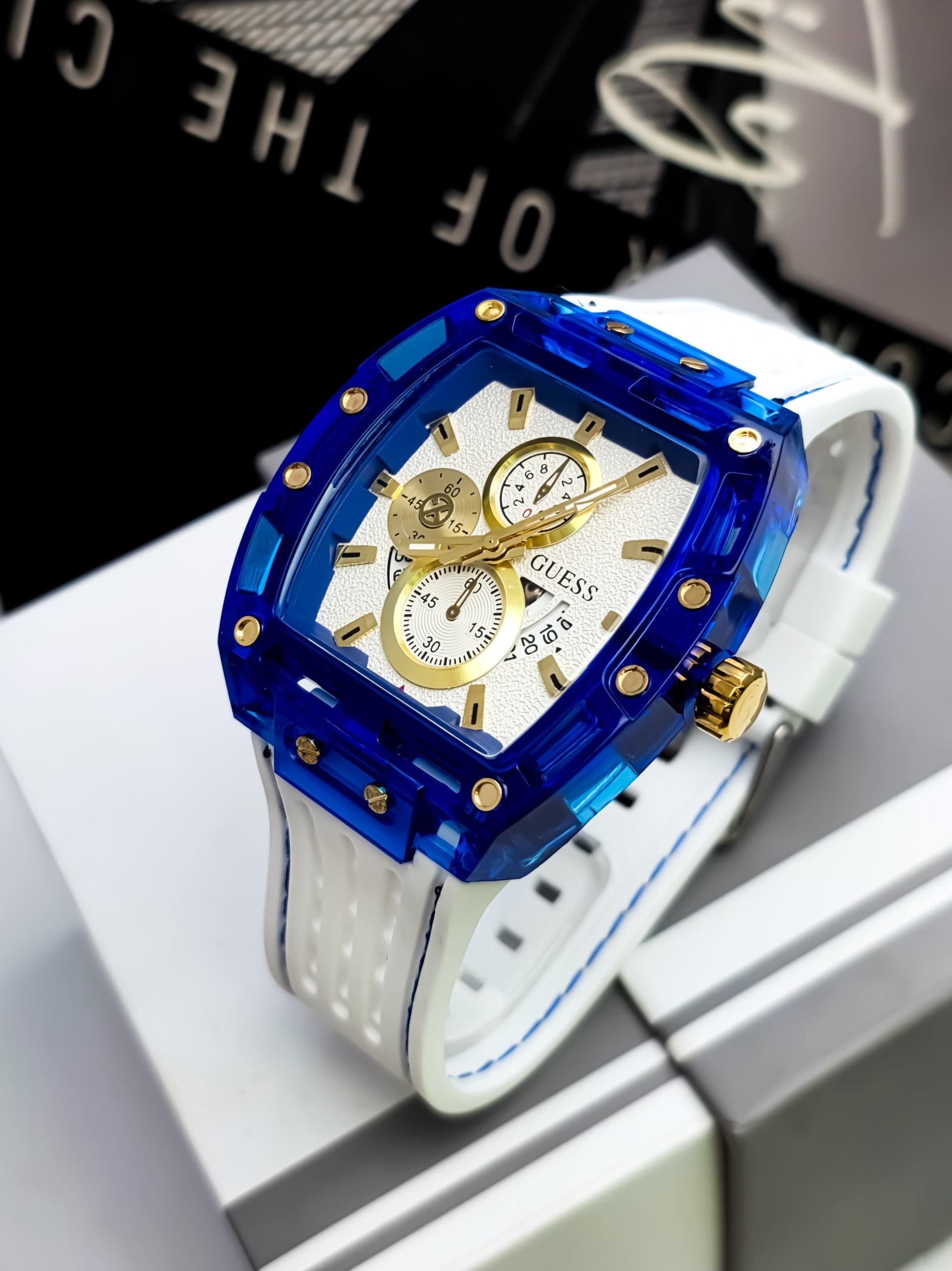 Relojería Guess – Exclusividad y Detalle en Cada ModeloEleva tu estilo con relojes de calidad premium, diseñados para quienes buscan distinción y elegancia. Cada pieza cuenta con:Pulso en silicona que garantizan durabilidadCaja en acero y aleaciones de metales que garantizan durabilidadHebilla en acero con acabados de lujoTotalmente contramarcados, con detalles finos y exclusivosGarantía por funcionamiento y defectos de fábrica