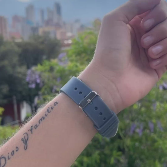 - Correa: Fabricada en silicona color gris oscuro, proporcionando comodidad y durabilidad, ideal para un estilo de vida activo.