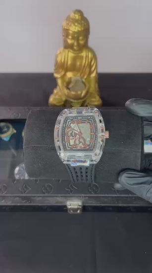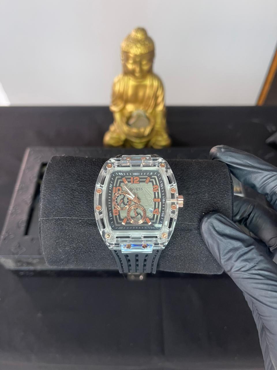 - Diseño: Estilo deportivo y moderno con una caja en forma de barril o rectangular y una esfera con detalles esqueletizados o multifunción que se transparenta, complementada con una correa de silicona negra.