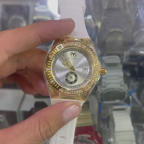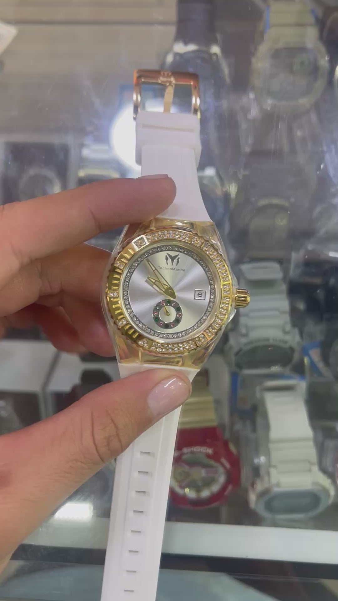 - Color y Materiales: Tiene una correa de silicona blanca combinada con una caja dorada, que en algunos modelos se describe como acero horneado con borde diamantado.