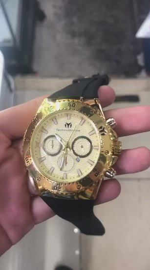 - Color: La imagen muestra una caja y esfera doradas con una correa de caucho negra, aunque existen variaciones dentro de la línea Manta.
