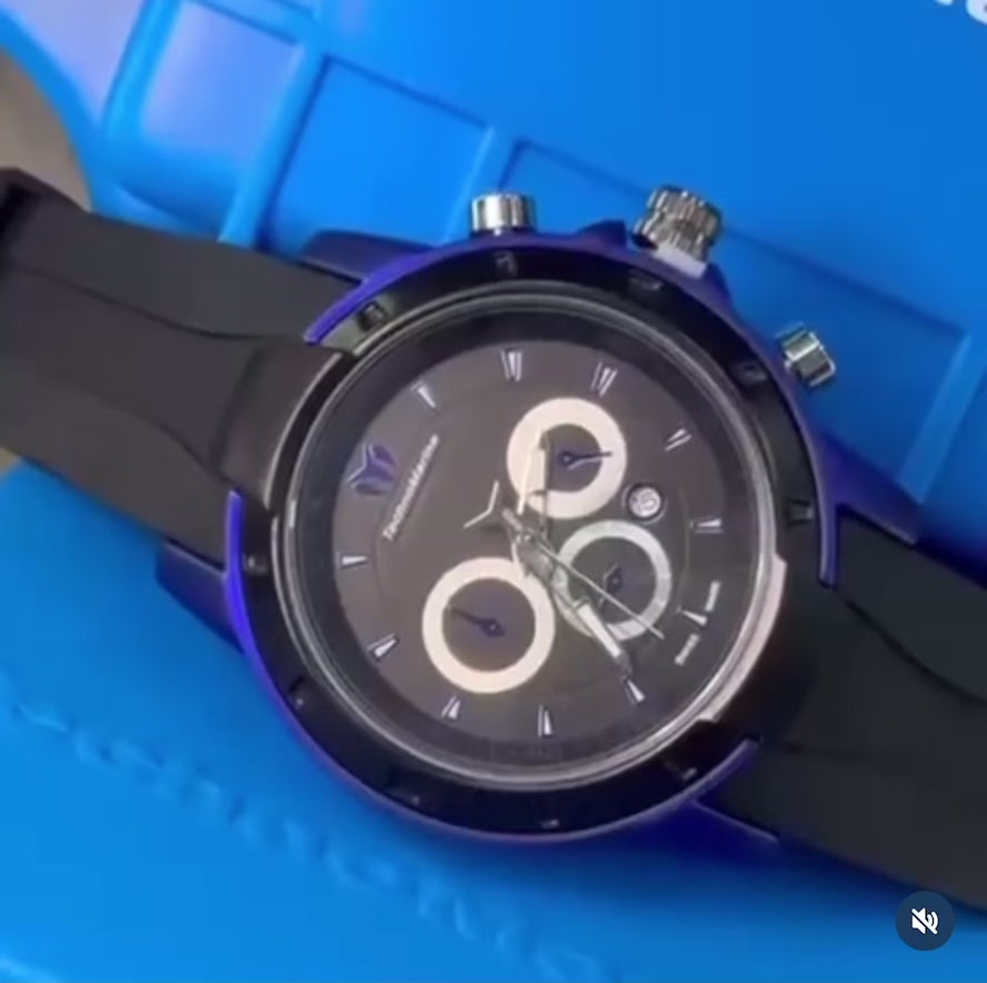 - Esfera: La esfera es oscura y cuenta con marcadores de hora claros, manecillas luminosas, y lo que parecen ser subesferas de cronógrafo con detalles en blanco, además de una ventana de fecha cerca de la posición de las 3 en punto.