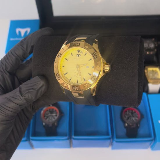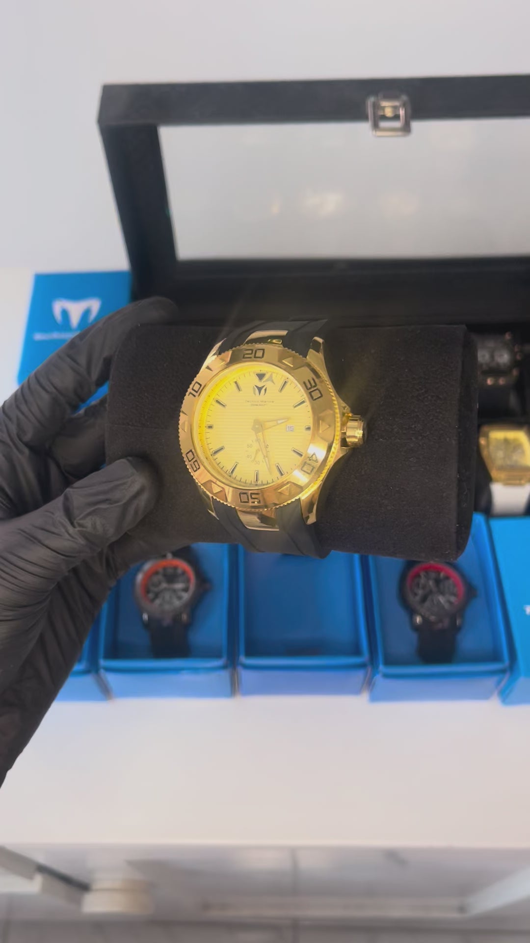- Esfera: La esfera, también en tono dorado, incorpora un diseño funcional y legible, con marcadores horarios y manecillas que suelen ser luminiscentes en muchos modelos Technomarine.