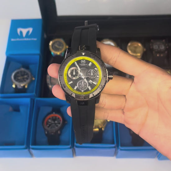 TechnoMarine con correa de silicona negra y detalles amarillos en el bisel y la esfera, que presenta subesferas de cronógrafo